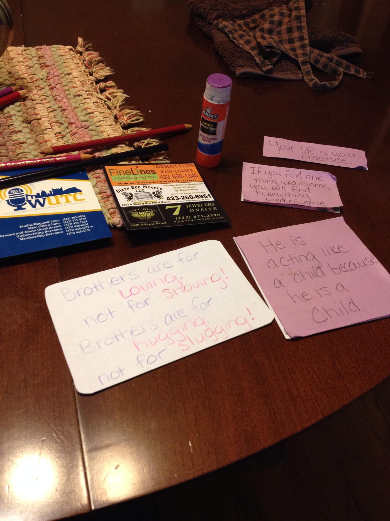 In my “me time ” this afternoon I decided to check something off my to do list. Putting up some inspirational thoughts. I repurposed some of those advertising magnets and have gotten some more helpful thoughts on the fridge. The purple ones are from Momma Zen by Karen Maezen Miller. I’ve had those up for a while and really love her book. Follow her on fb for some great insights.