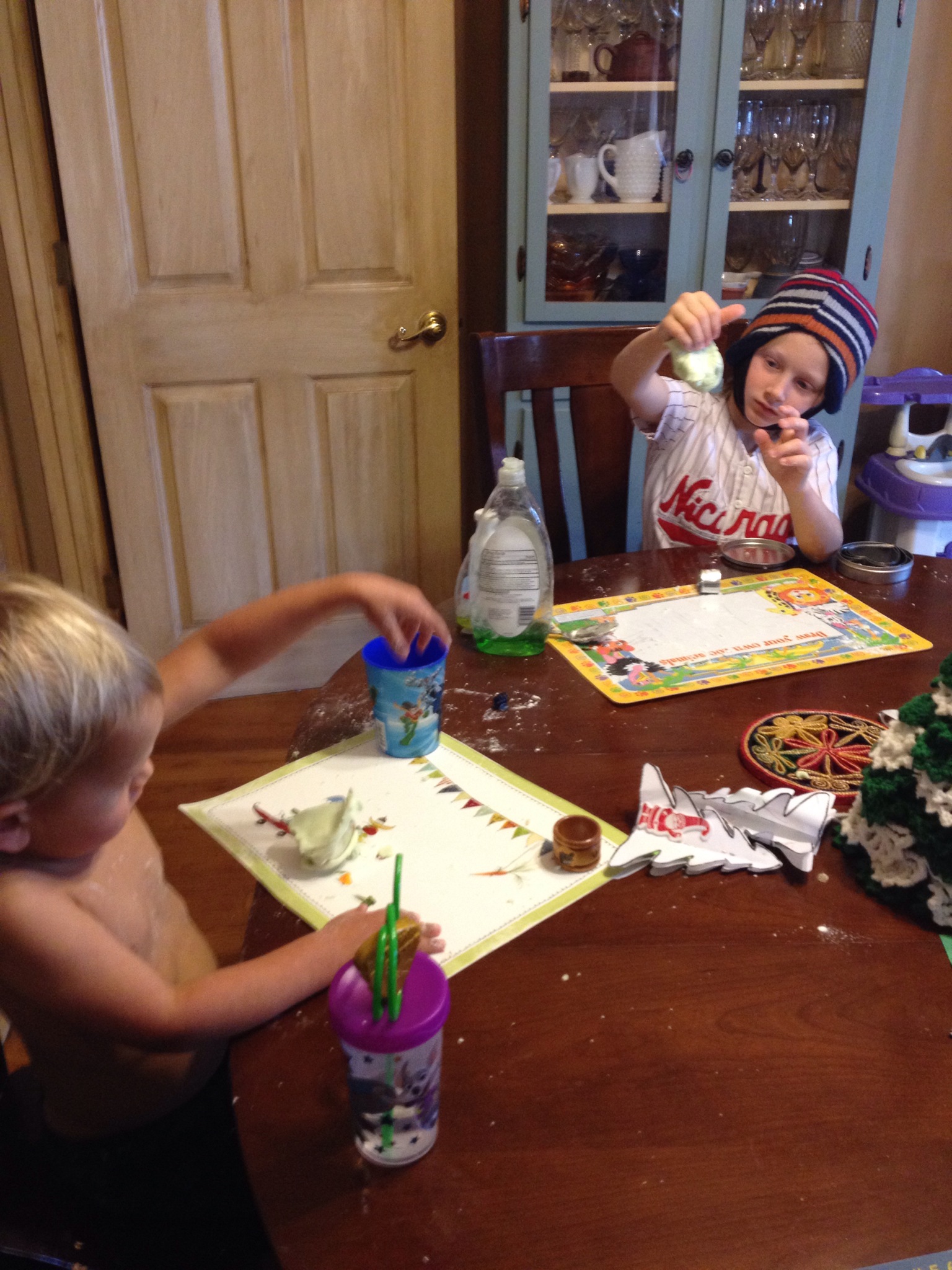 Unfortunately the prep and clean up time lasted longer for mommy than the playtime for the boys! We kept the doughs in a plastic baggie though so they could be used another day.