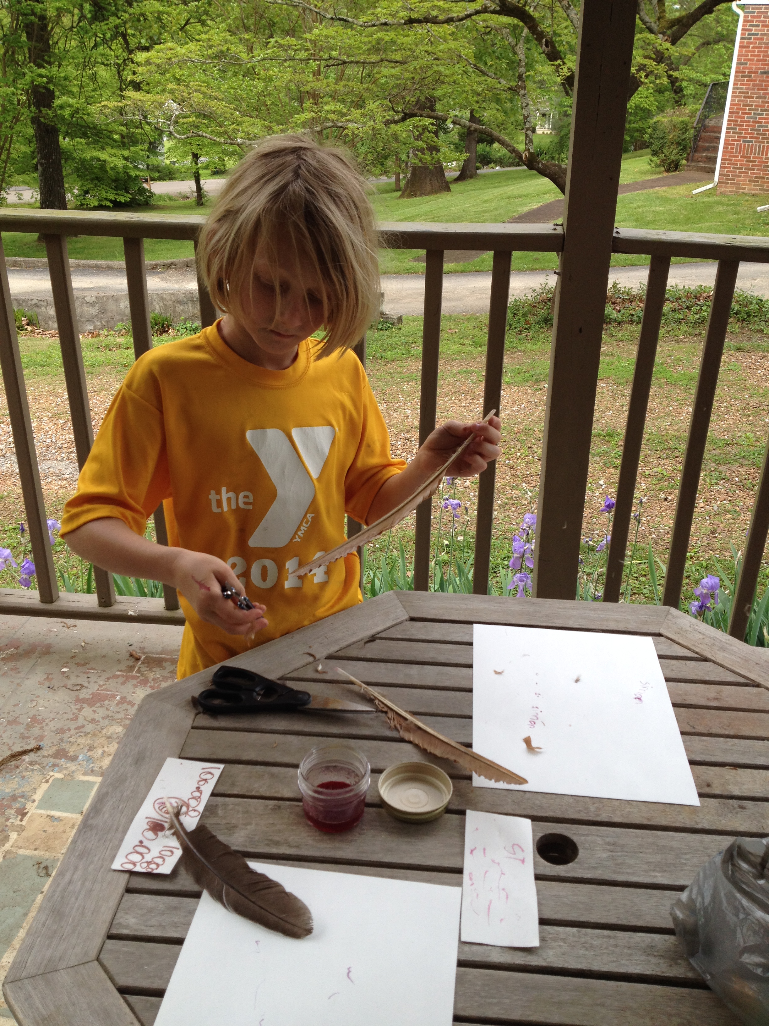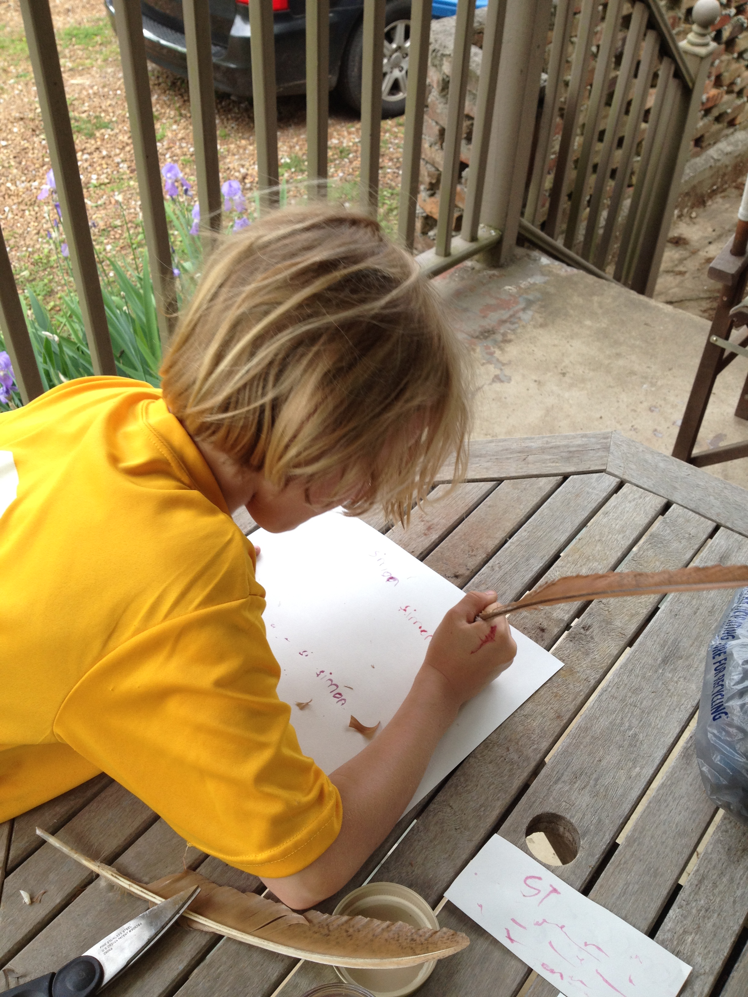 Simon has been interested in making ink and writing with a quill pen for quite some time now.  I can’t recall exactly where the idea started.  Perhaps from the Little House on the Prairie books we have been listening to in the car.  We finally found a good source of feathers at our friend’s house and so the project began.  We watched a few youtube videos on how to make a quill pen.  One was very complicated and seemed impossible for us to do, but we continued to search and found a really easy tutorial.  We made up some simple  berry ink and voila…writing with a quill pen.  We used some old frozen raspberries and blueberries for our ink.  The color starts out as a marvelous magenta and as it dries it turns a lovely midnight blue color.  I myself am just fascinated and plan to write some inspirational signs for around the house with the ink.  We have also started to research other forms of writing and the development of pen technology!
