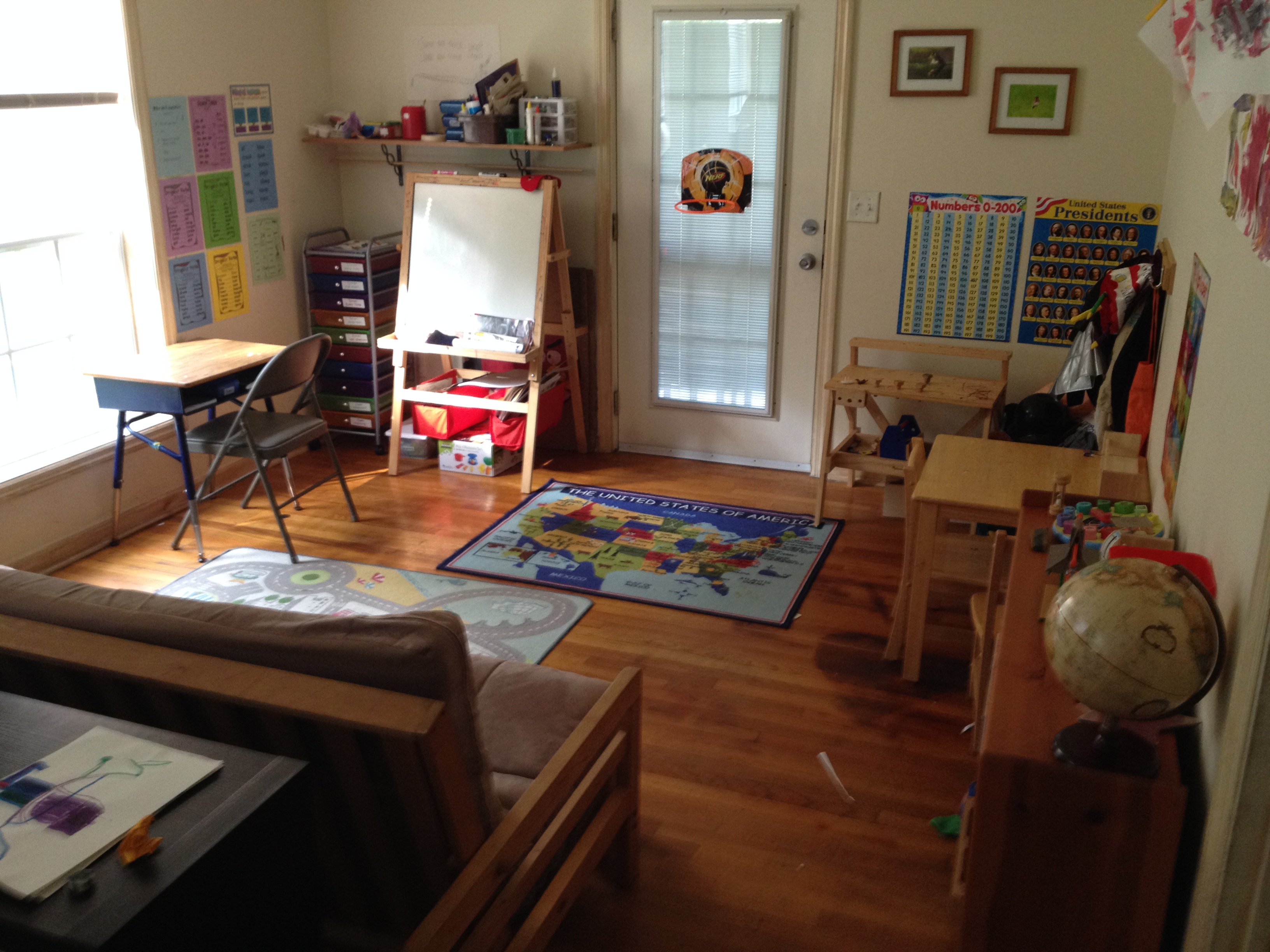 Rick and I spent a bit of time rearranging our front room to make the classroom space more usable and separate from the toys.  Last year we often had to spend a fair amount of time getting the toys out of the way before we could sit at the desks or on the floor to do some schoolwork.  I wanted that obstacle out of our way this year.