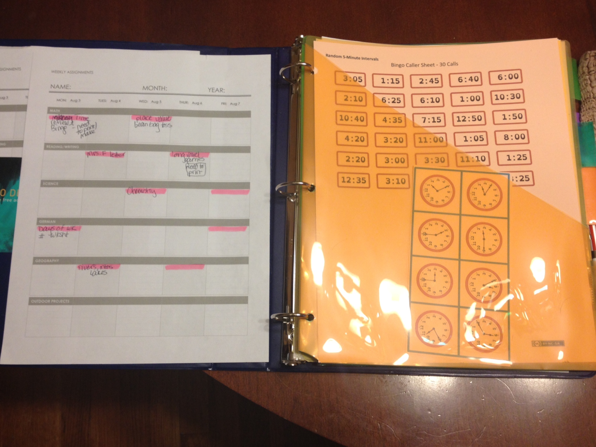 I also set up a binder system in efforts to keep track of what we were doing each day/week and have a place to hold all the printouts or game pieces we would be using for each activity.  That was also a problem last year…keeping things in too many different places and not being able to find them when I needed them.  I have been using the binder system for a few weeks now and I have reused my weekly schedule and it’s activities a couple of times because we have been having a lot of other activities come up.  But that’s the way we plan to do things, we’re not staying home on a beautiful day just because the schedule says we are supposed to be studying lakes and rivers of China or place value!
